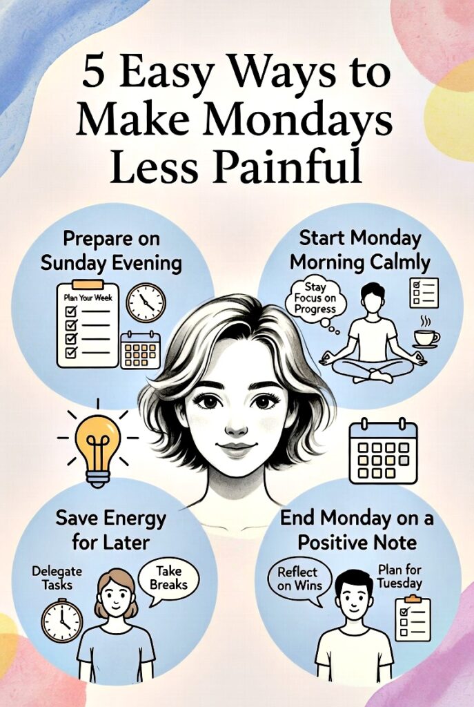 Here are five simple ways to make Mondays feel much less painful. These easy steps help you prepare, start gently, think positively, save energy, and end the day well.